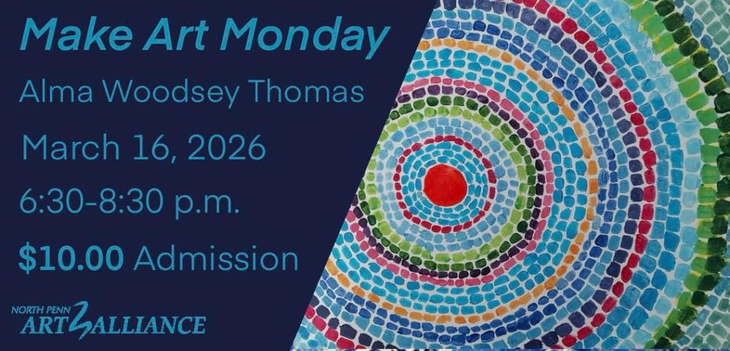 Join us on Monday, March 16, 2026 from 6:30-8:30 pm over at Eclipse Center for Creative Community located at 30 Vine St in Lansdale for Make Art Monday. For this month’s project, in honor of Black History Month and Women’s History Month, we will be taking inspiration from Alma Woodsey Thomas’ colorful paintings, and creating our own colorful artworks with paint on paper. The cost of admission is $10. All skill levels are welcome, so feel free to bring friends. We hope to see you there!