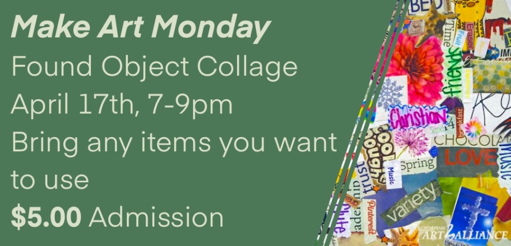 Come out and join us on Monday, April 17th, for Make Art Monday from 7-9pm at the North Wales Arts & Cultural Center, located at 125 N. Main Street in North Wales. In honor of Earth Day we will be making found object collages. Bring any items you’d like to up-cycle into a work of art. Admission costs $5.00. Parking is available in the back of the building off of Second Street. We look forward to seeing you all!