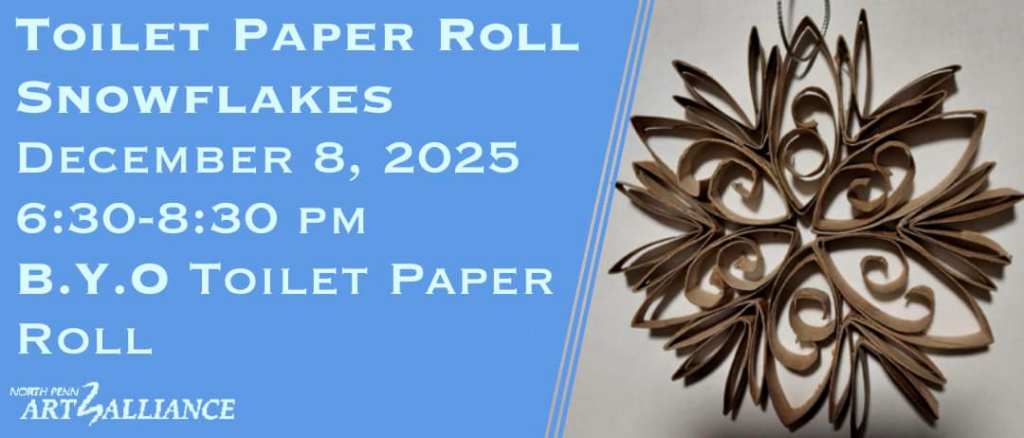 Join us on December 8th from 6:30-8:30 pm over at Eclipse Center For Creative Community, located at 30 Vine Street in Lansdale for a fun, free, Winter Craft. For this month’s meeting we will be making Toilet Paper Roll Snowflakes. These fun and easy to make snowflakes are a perfect way to recycle and decorate, or they can be a great gift. Please bring your own toilet paper rolls, the more rolls you use, the more elaborate your snowflake can be (paper towel rolls will also work). We will have some available first come first serve, but supplies are limited. Feel free to bring friends and family, all skill levels are welcome!